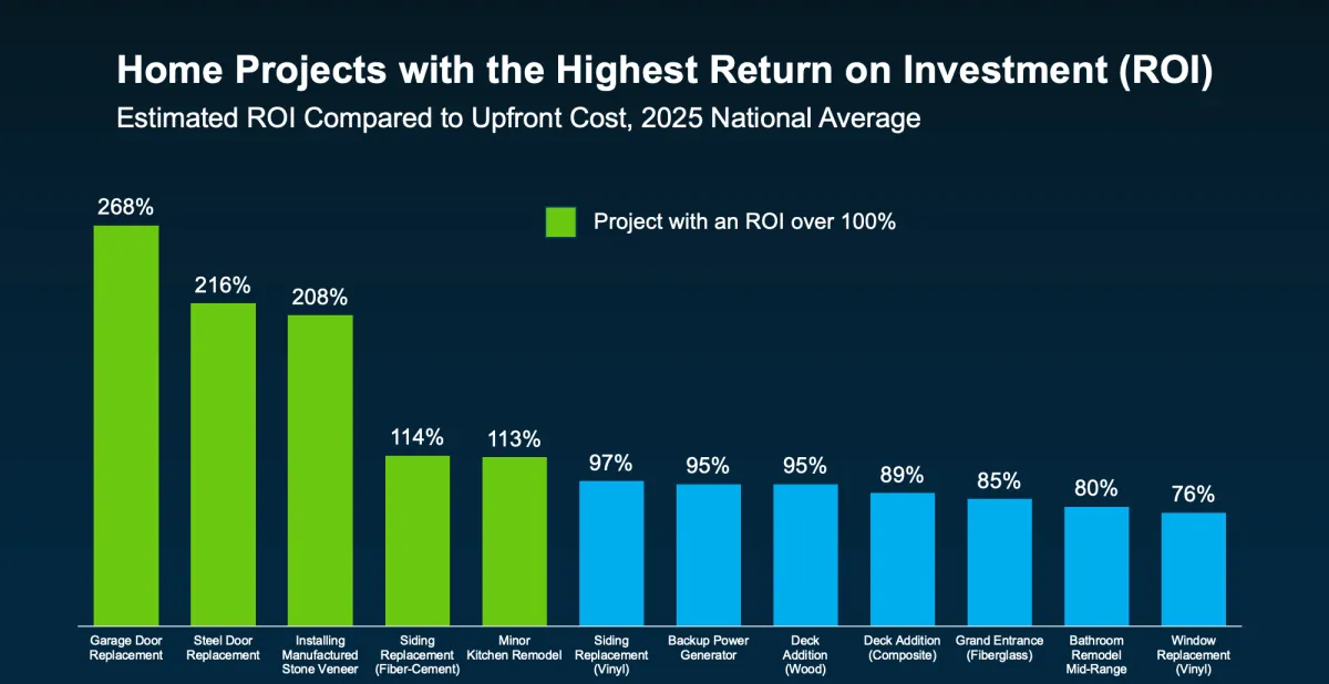 The highlighted projects in the chart below represent updates that tend to add the most value. While the list includes a wide range of options, some of the top performers aren’t major renovations at all. In fact, a few involve simple upgrades—like replacing doors.